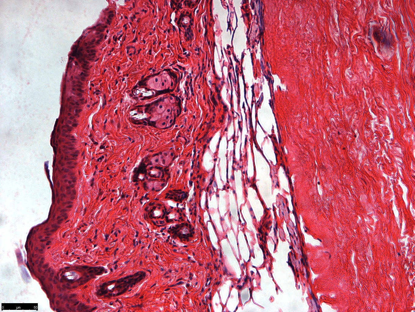 Mouse dermis, epidermis, and fat layers imaged with a more standard bright field microscope.