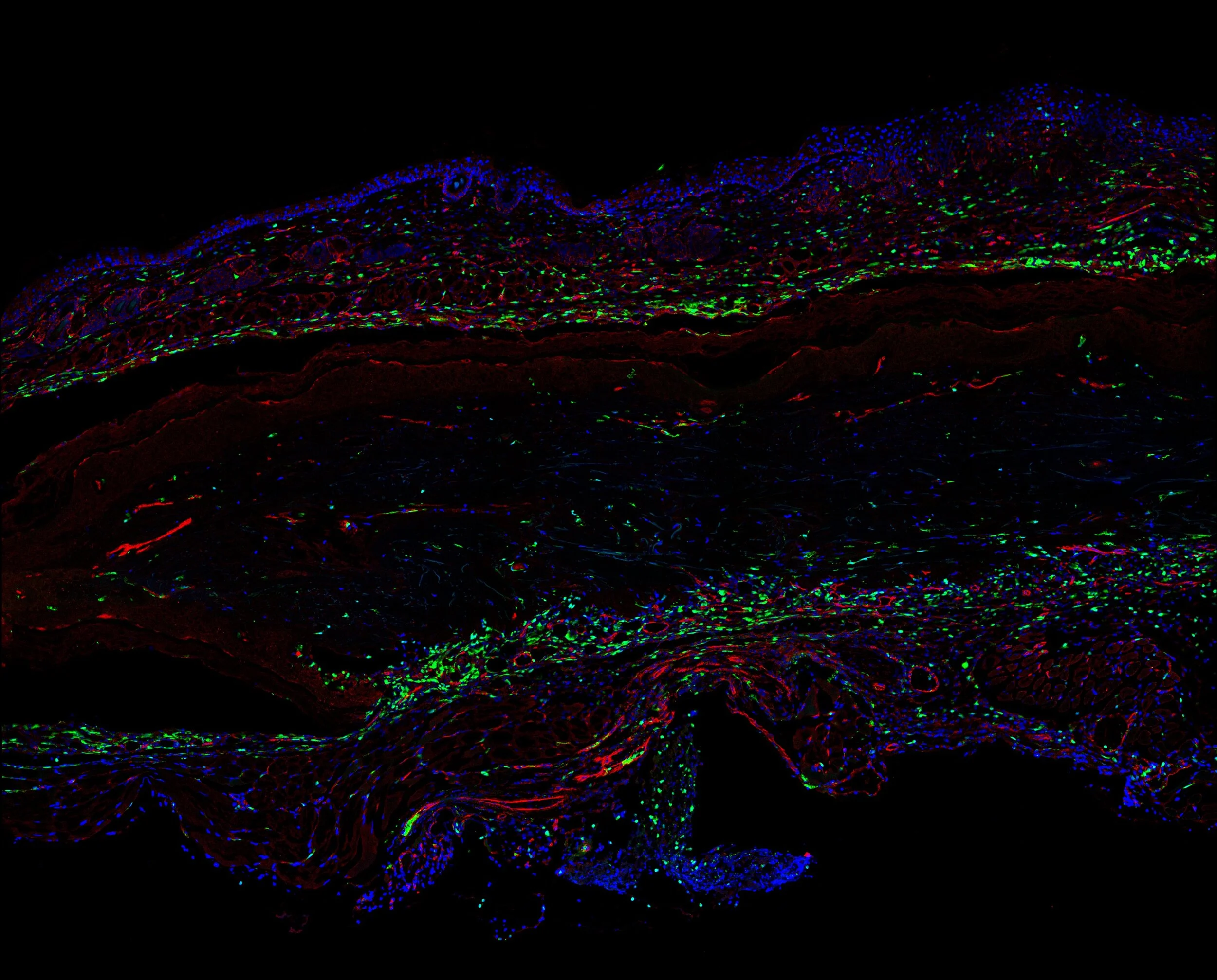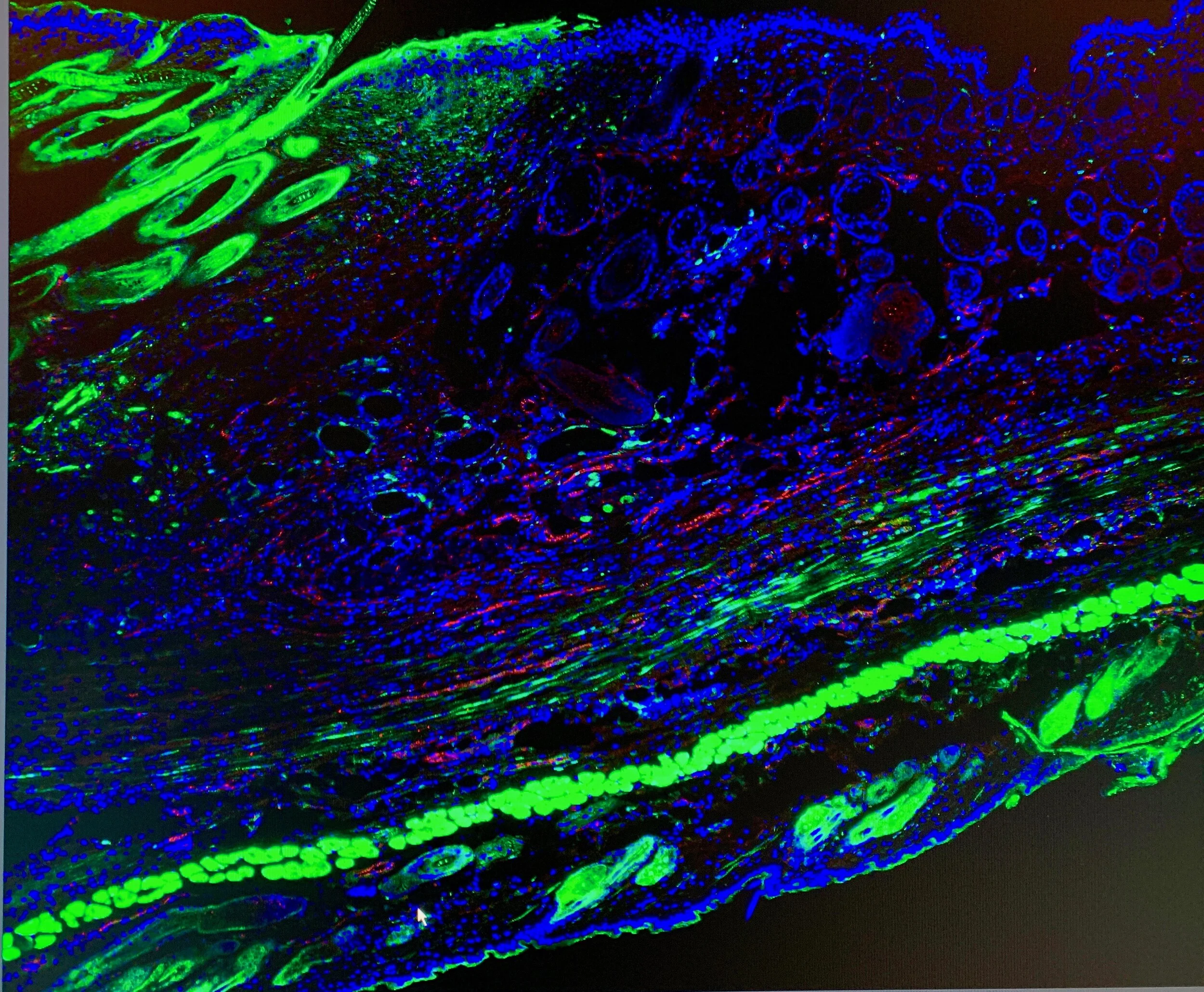 The image above shows in blue, mouse skin cells of different types (epidermis, dermis, and muscle fascia), and in red, the cross sections of blood vessels within the skin at 10X magnification. A confocal microscope is used to achieve high quality fluorescence images by using a pinhole technique: out of focus light is blocked out during image formation. Each took roughly 2 minutes to capture.